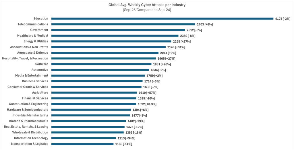 Government institutions, a long-standing focus for both criminal and nation-state actors, recorded 2,512 weekly attacks (–6% YoY).